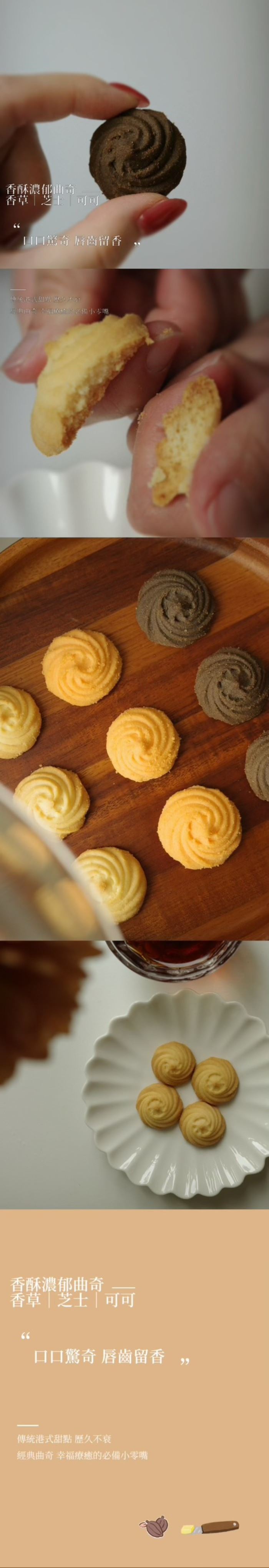 | 內容物(完整成份/食品添加物) | 香草曲奇餅乾:麵粉、奶油、蔗糖、雞蛋蛋白、玉米粉(非基因改造)、香草粉[香料、葡萄糖、品質改良劑 (二氧化矽、葡萄糖、阿拉伯膠、麥芽糊精)]、鹽。 可可曲奇餅乾:麵粉、奶油、蔗糖、雞蛋蛋白、可可粉、玉米粉(非基因改造)、鹽。 芝士曲奇餅乾:麵粉、奶油、蔗糖、雞蛋蛋白、芝士粉[乾酪、麥芽糊精、食鹽、乳化鹽(磷酸氫二鈉)、著色劑(食用黃色五號)、天然食用色素(婀娜多)、香料]、玉米粉(非基因改造)、香草粉[香料、葡萄糖、品質改良劑 (二氧化矽、葡萄糖、阿拉伯膠、麥芽糊精)]、鹽。 |
