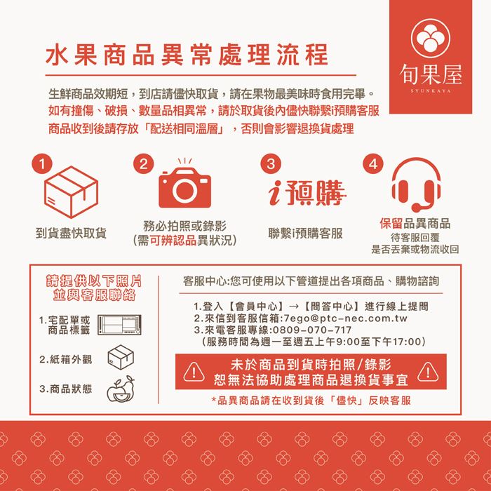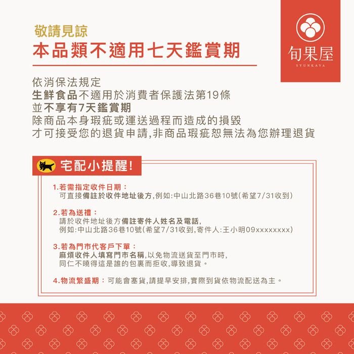 3.生鮮商品性質具備消保法第十九條所定之合理例外情事「保存期限較短商品」,故不適用於7天鑑賞期退貨,不得以其他主觀認知差距個人因素(香氣、大小、甜度、色澤、口感、不喜歡、口味)等理由退貨。請於當日收到貨,若有重大瑕疵(水果發霉、商品與訂單出貨不符等等)請立即拍照並在24hr內聯繫我們線上客服,將由專人為您處理後續。 |