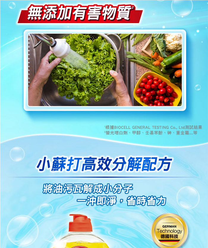 • 快速渗透汙垢並分解成水溶性小分子,提升洗淨效果