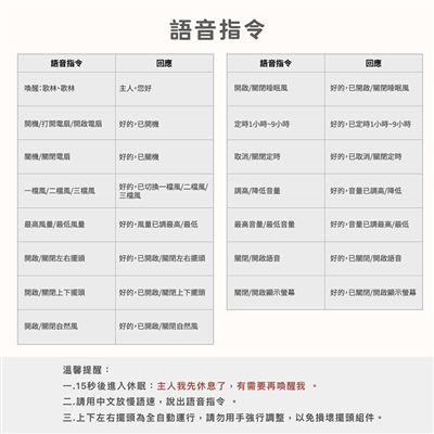 | 注意事項 | ※使用前請詳閱說明書 ※15秒後進入休眠:主人我先休息了,有需要再喚醒我。 ※請用中文放慢語速,說出語音指令。 ※上下左右擺頭為全自動運行,請勿用手強行調整,以免損壞擺頭組件。 ※請放置於陰涼乾燥、兒童無法觸及之處。 ※商品因環境光線、相機參數、螢幕顯色的不同,可能會有些許色差,請以實際收到商品為準。 ※產品尺寸為手工測量會有些許誤差,請以實際收到商品為準。 7天「鑑賞期」非「試用期」,若經拆封、使用後導致商品缺乏完整性,恕不提供退換貨服務 |