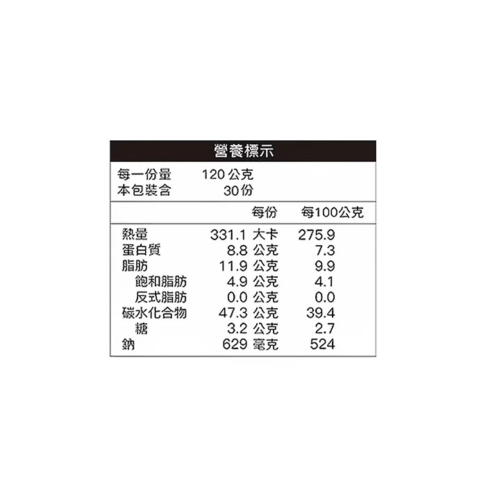 本產品含有麩質的穀類、大豆、芝麻及其製品,不適合對其過敏體質者食用。本產品與其他含有蛋、甲殼類、芹菜、奶類、花生的產品於同一工廠生產。