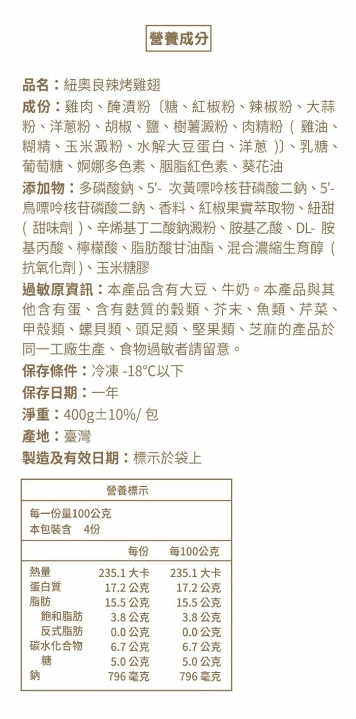 | 商品名稱 | [卜蜂]紐澳良辣烤雞翅(二節翅)400g/包 |