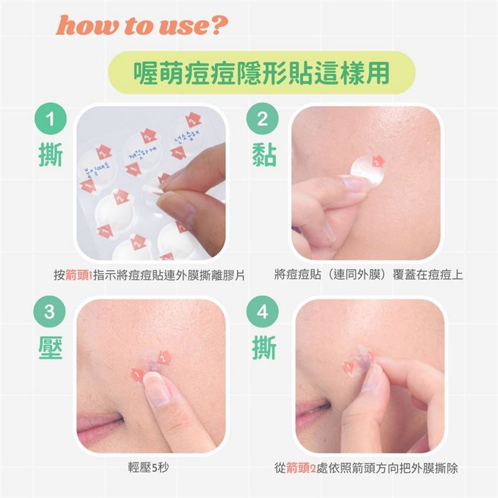 * 撕下痘痘貼後,輕輕貼在痘痘上並輕壓邊緣使其完全服貼。