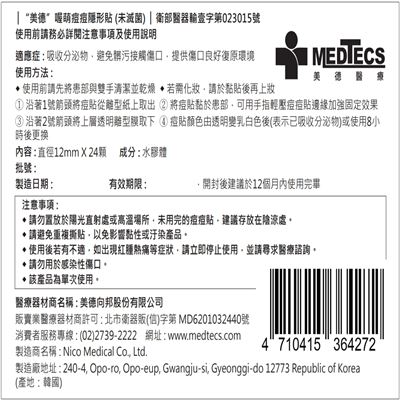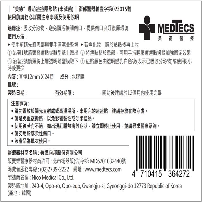 | 醫療器材許可證核定品名 | "美德" 喔萌痘痘隱形貼(未滅菌) | |