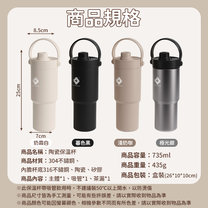 | 商品名稱 | 【買一送一】《棠品居》手提陶瓷保溫杯735ml(4色可選) |