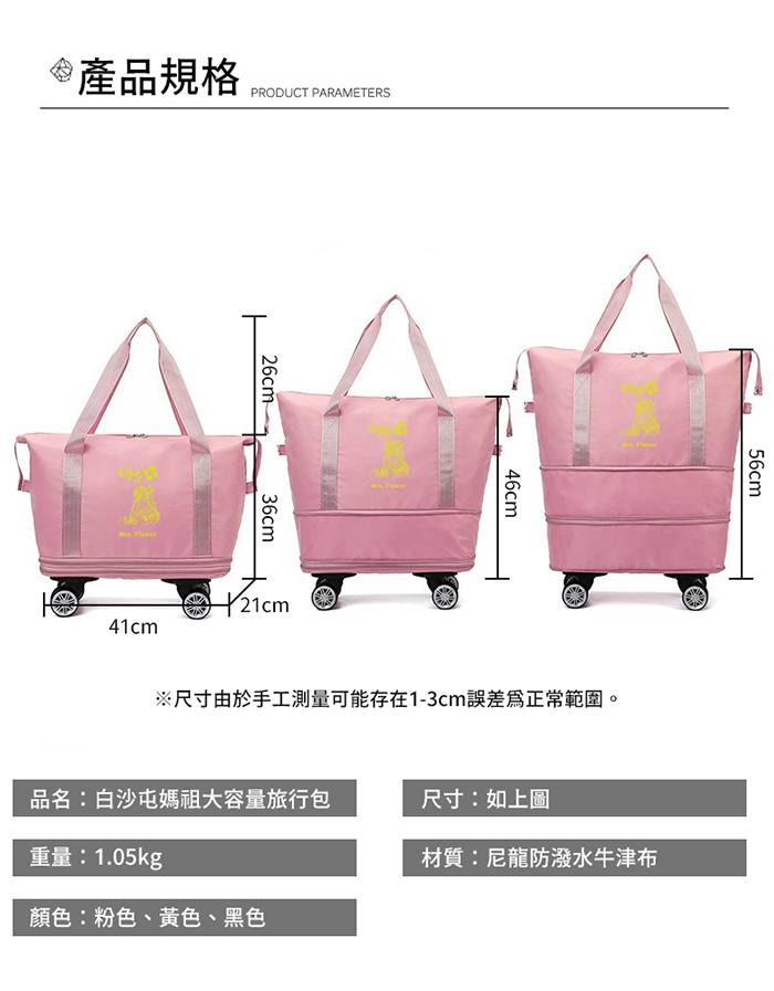 | 【商品名稱】 | 【花太太x白沙屯媽祖】大容量旅行收納包 (擴充容量 加裝四輪輔助) - 3色可選 |