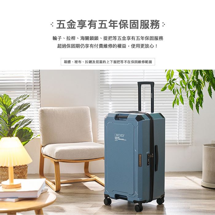 💎五金享有五年保固服務:輪子、拉桿、海關鎖、提把等五金享有五年保固務務,超過保固期仍享有付費維修的權益,使用更放心!