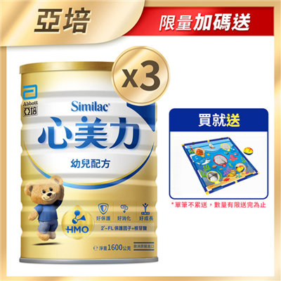 | 包裝內容/商品規格 | [買3罐送贈品]亞培 心美力HMO 3幼兒營養成長配方(1600gx3罐)+(贈品)亞培 趣味沙包投籃組x1 |