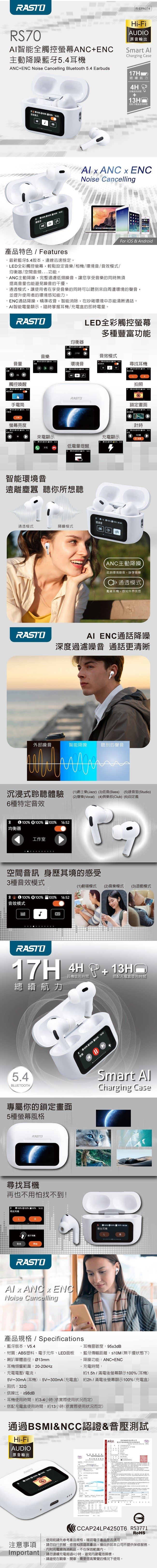 | 商品名稱 | RASTO RS70 AI智能全觸控螢幕ANC+ENC主動降噪藍牙5.4耳機 |