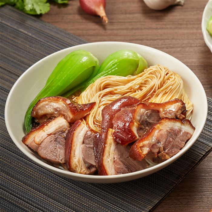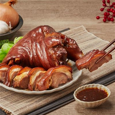| 內容物(完整成份/食品添加物) | 豬腳(加拿大)、滷汁(水、醬油、料理米酒、青蔥、冰糖、醬油膏、大豆油、紹興酒、蔗糖、蒜仁、L-麩酸鈉、焦糖色素、八角、肉桂、甘草)、蒜蓉醬{醬油膏、水、蒜仁、蔗糖、品質改良劑[醋酸鈉(無水)、脂肪酸蔗糖酯]}、炸油(大豆油、軟質棕櫚油、矽樹脂)、醬油 |