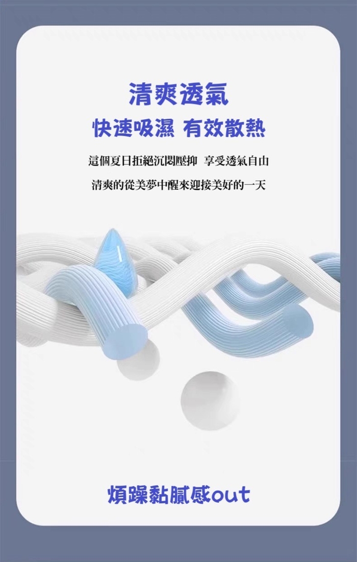 清爽一整天觸感柔順,迅速散熱,不黏身且乾爽,給肌膚睡眠無負擔😎