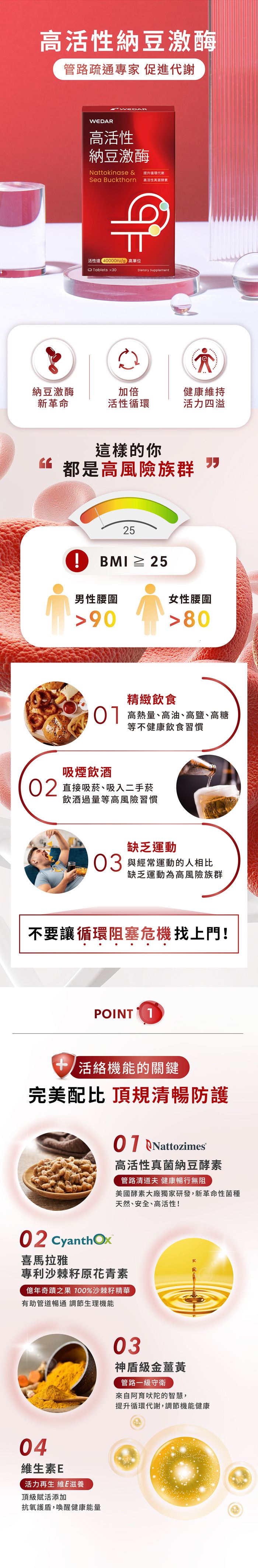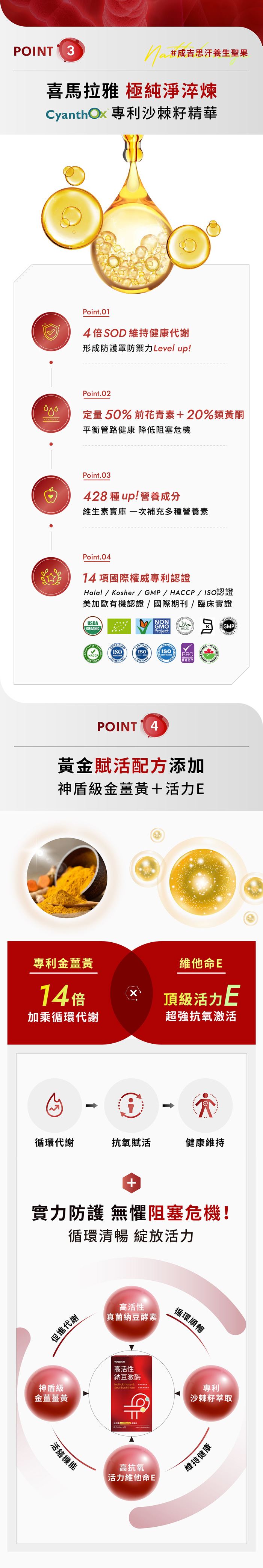 | 內容物 (完整成份/食品添加物) | 玉米糖漿粉、乳糖顆粒、蛋白質分解酵素Nattozimes®40000FU/g(麥芽糊精、蛋白酵素AM、蛋白酵素6.0、胜肽分解酵素)、維生素E[乙酸dl-α生育醇酯(維生素E)、麥芽糊精、辛烯基丁二酸鈉澱粉、二氧化矽]、薑黃萃取物、聚乙烯吡咯烷酮、微結晶狀α-纖維素、CyanthOx™沙棘籽萃取物、二氧化矽、硬脂酸鎂、膜衣成分(羥丙基甲基纖維素、二氧化鈦、食用黃色五號、食用紅色六號、食用藍色一號、矽酸鋁鉀珠光色素) |