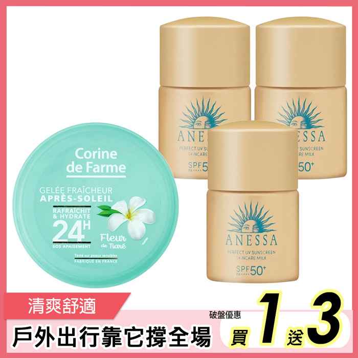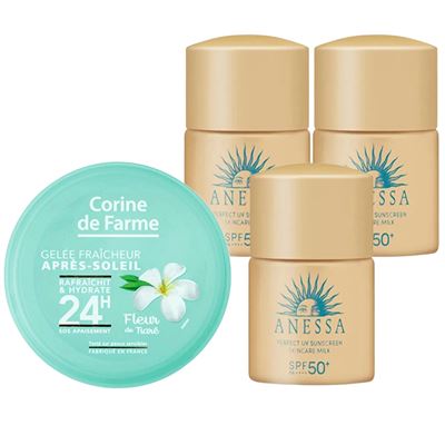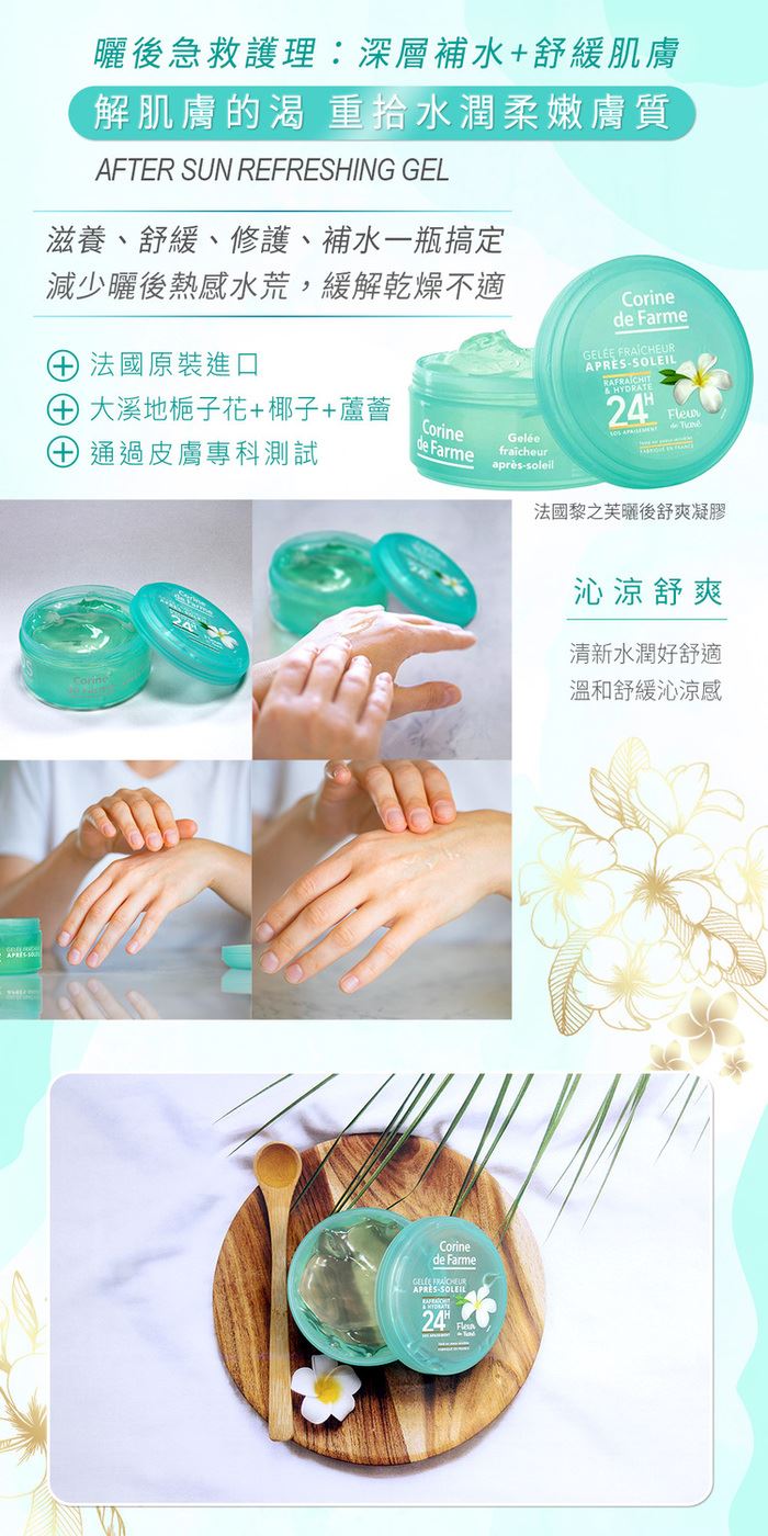 | 使用方法 | 防曬使用方法:取適量,塗抹於肌膚上,輕輕推開後,可用指腹輕拍幫助吸收。 曬後凝膠使用方式:取適量凝膠塗抹在乾淨肌膚上,讓其自然吸收。等待5分鐘,讓凝膠晾乾。可直接使用於曬傷與不適部位,有冷卻緩解作用 |
