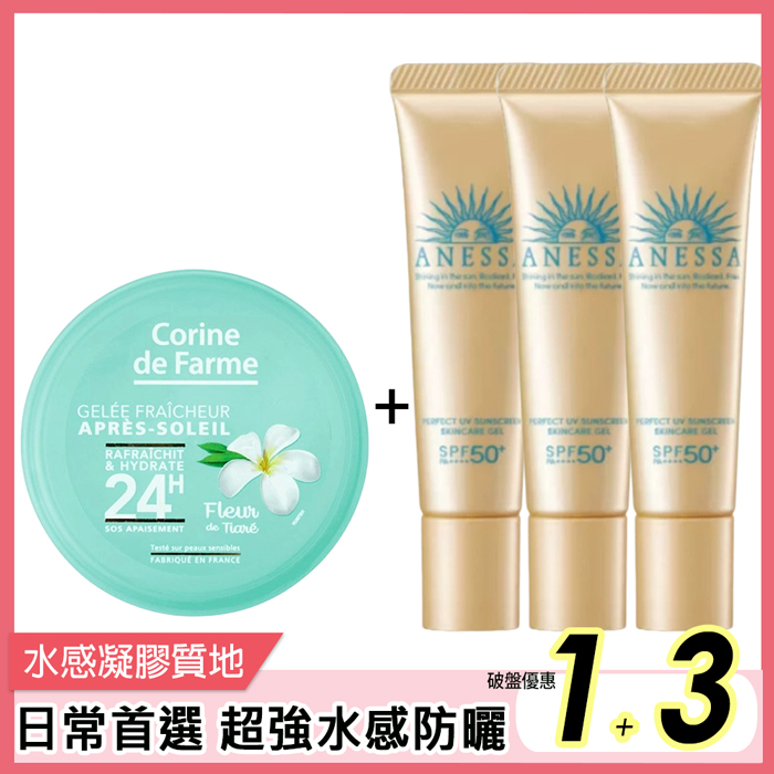 | 使用方法 | 防曬使用方法:取適量塗抹於臉部或身體肌膚上,均勻推開,再以指腹輕拍加強吸收效果 曬後凝膠使用方式:取適量凝膠塗抹在乾淨肌膚上,讓其自然吸收。等待5分鐘,讓凝膠晾乾。可直接使用於曬傷與不適部位,有冷卻緩解作用 |