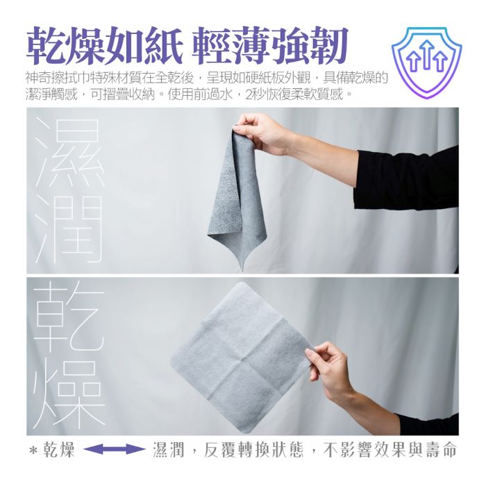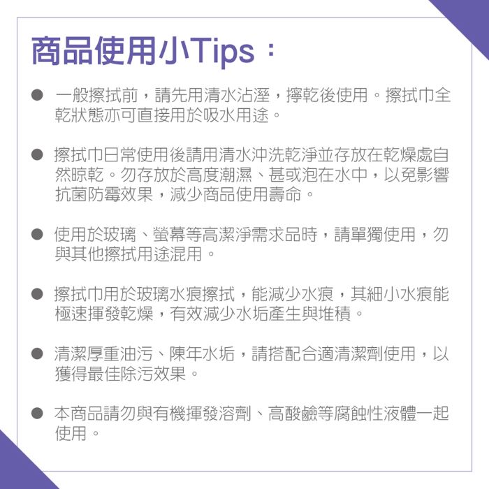| 注意事項 | 完全乾燥時,浸水數秒充分吸水後即可濕擦使用。使用後請用水清潔擰乾,並存放於陰涼乾燥處,避免陽光直射。 |