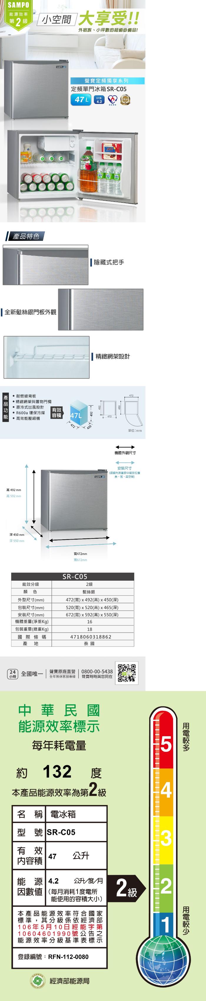 | 商品名稱 | 【SAMPO聲寶】47公升單門冰箱 SR-C05 |