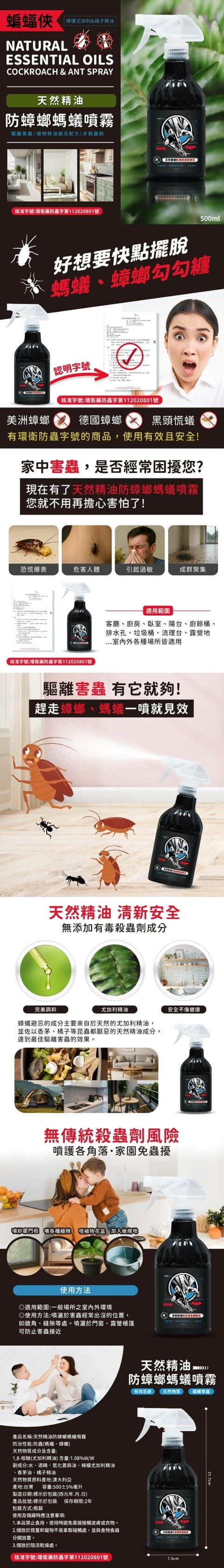 | 商品名稱 | 蝙蝠俠-天然精油防蟑螂螞蟻噴霧 (500ml*6瓶) |