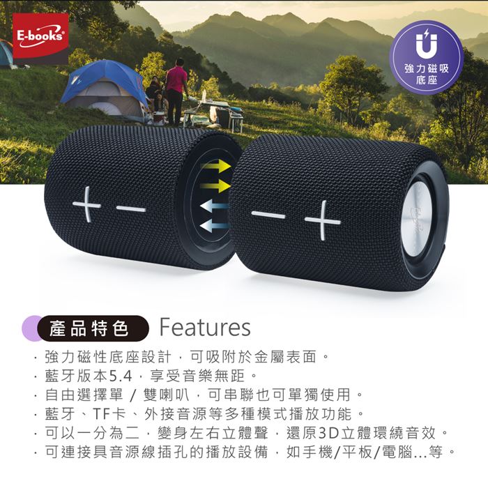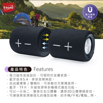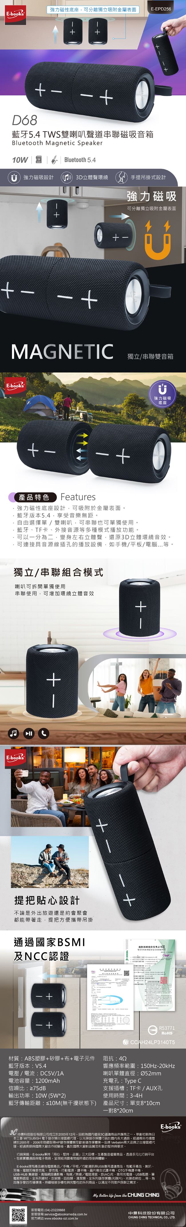 | 【商品名稱或型號】 | E-books D68 藍牙5.4 TWS雙喇叭聲道串聯磁吸音箱 |