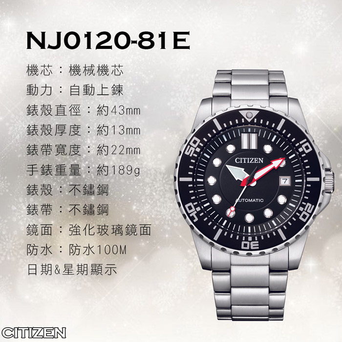 | 【商品名稱】 | 【CITIZEN】黑水鬼自動上鍊不鏽鋼機械錶(NJ0120-81E) [平輸] |