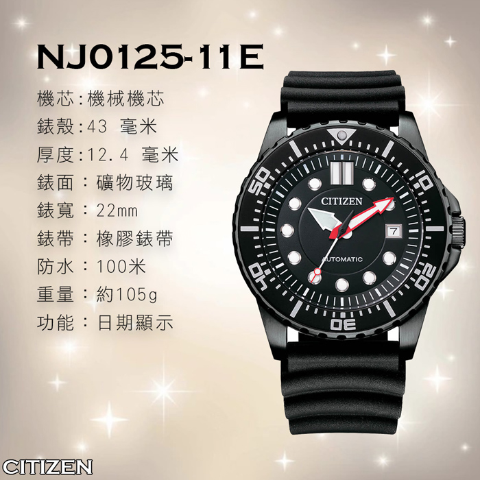 | 【商品規格】 | 品牌:CITIZEN 型號:NJ0125-11E 機芯:機械機芯 錶殼直徑:約43mm 錶殼厚度:約12.4mm 手錶重量:約105g 錶殼:不鏽鋼 錶帶:合成橡膠錶帶 鏡面:強化玻璃鏡面 防水:防水100M 日期顯示 |