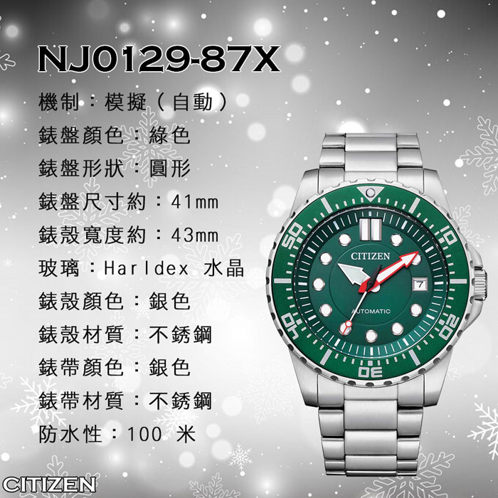 | 【商品名稱】 | 【CITIZEN】Mechanical 綠水鬼100米潛水型運動錶(NJ0129-87X) [平輸] |