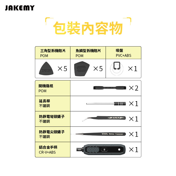 包裝內容:魚鱗型拆機翹片×5、三角型拆機翹片×5、 鋁合金手柄×1、吸盤×1、防靜電尖頭鑷子×1 防靜電彎頭鑷子×1、開機撬棍×2、延長桿×1 螺絲起子頭-CR-V H4*28mm×144 螺絲起子頭-S-2 H4×45mm×4 螺絲起子頭-SOCKET×14 |