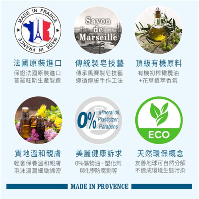於1688年欽定以72%初榨橄欖油為皂基,添加南法生產天然植萃香氛的完美配方製皂,