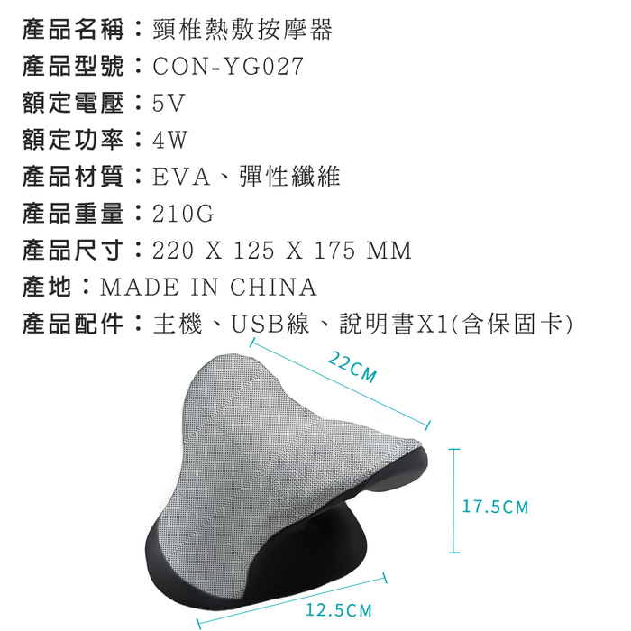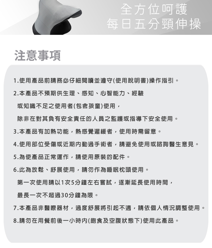 | 【內容物】 | 三代頂腰器x1、說明書x1、頸椎熱敷按摩器x1、USB線x1、說明書x1 |