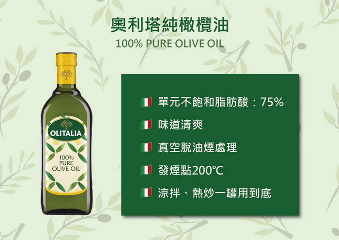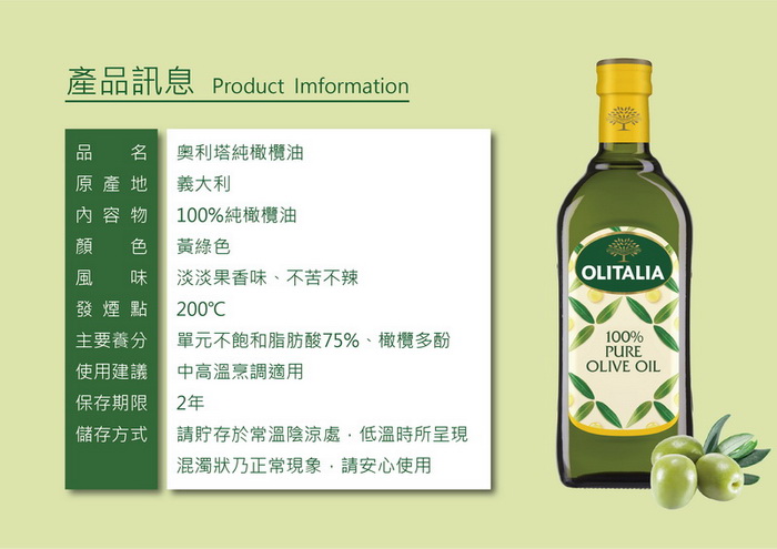 營養標示: 純橄欖油1000ml-(10ml/份 本品共含100份)