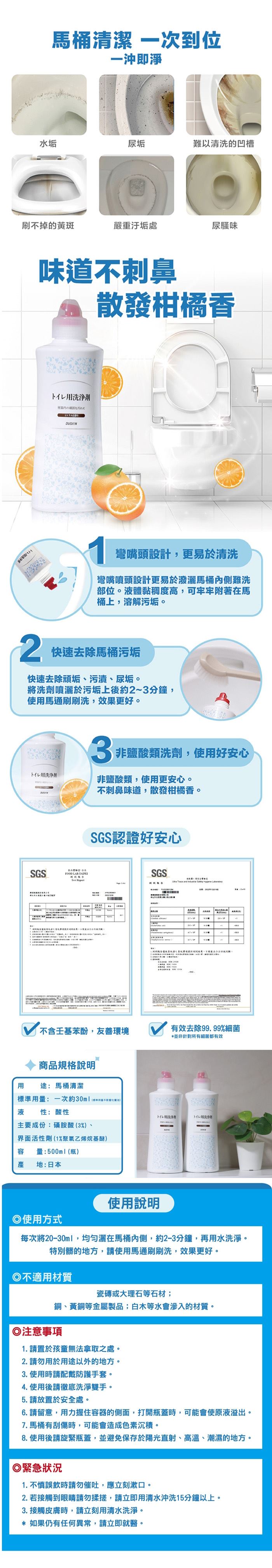 ·請置於孩童、失智症患者無法拿取之處 ·使用時請配戴防護手套,並使用馬桶刷 ・使用後請洗淨雙手·請避免清潔劑長期附著馬桶 ・旋開瓶蓋·請避免用力按壓瓶身,以防清潔劑噴出 ·馬桶有刮傷時,可能會造成色素沉澱 ·使用後請旋緊瓶蓋·請勿用於用途以外處 ・避免保存於陽光直射、高溫、潮濕或有凍結之處處 |