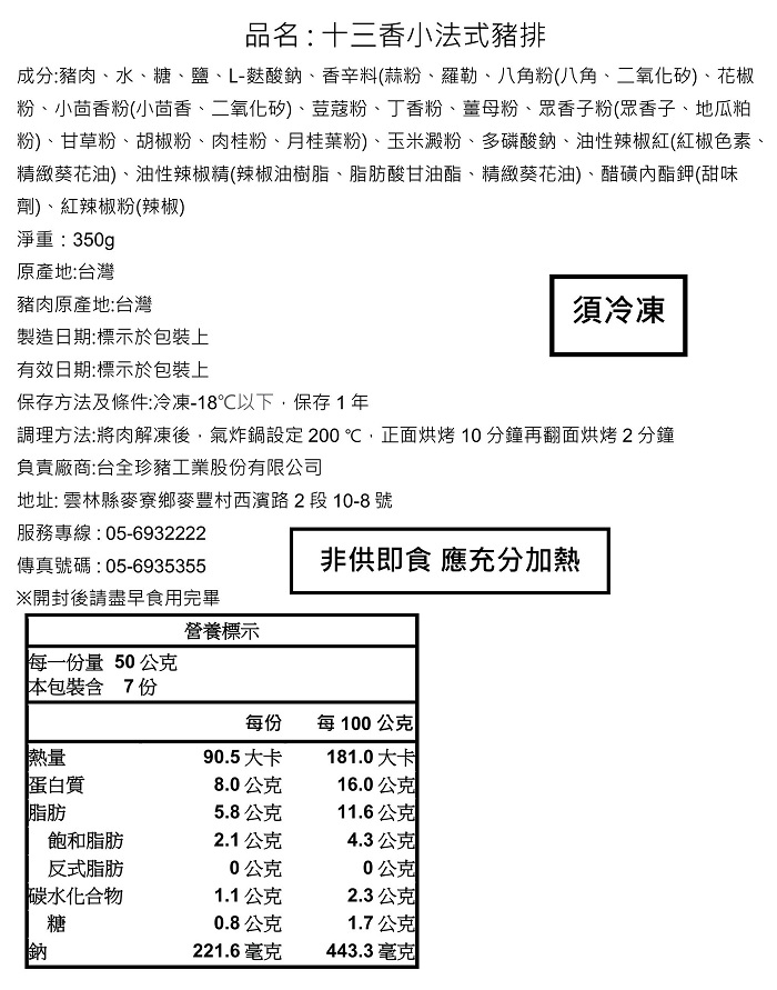 | 商品名稱 | 【台全牧場】13香小法式豬排6盒(350g) |