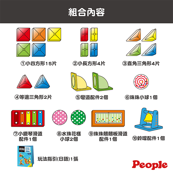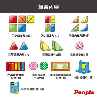 | 內容物 | 1.小四方形15片、2.小長方形4片、3.直角三角形4片、4.等邊三角形2片、5.彎道配件2個、6.珠珠小球1個、7.小鐵琴滑道配件1個、8.水珠花樣小球2個、9.珠珠翹翹板滑道配件1個、10.鈴噹配件1個、11.玩法指引(日語)1張。 |