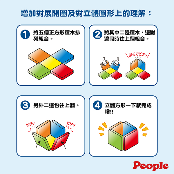 1.小四方形:挑戰從平面到立體!即使是小手也好拿取厚度的片狀磁性積木。