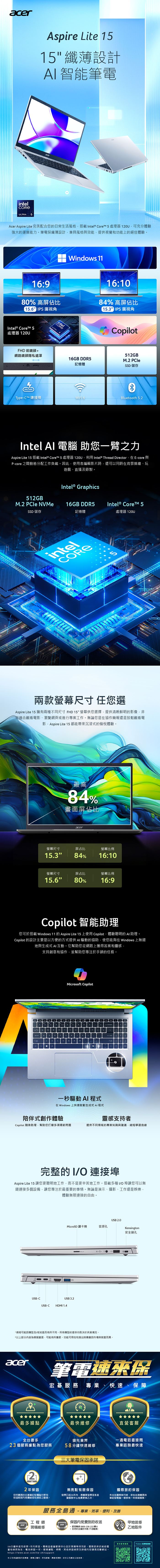 | 【商品名稱/型號】 | 【Acer 宏碁】Aspire LiteAL15-51P-50GN 15.3吋文書筆電 |