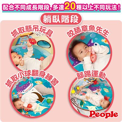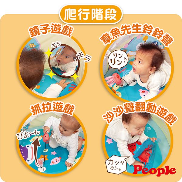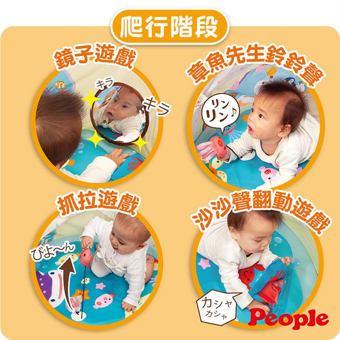 3.抓拉遊戲:抓一抓章魚先生,會發出鈴鈴聲,還有旁邊包覆著網子的小球,盡情的玩耍,好有趣呢! 躺臥階段 爬行階段 坐立階段