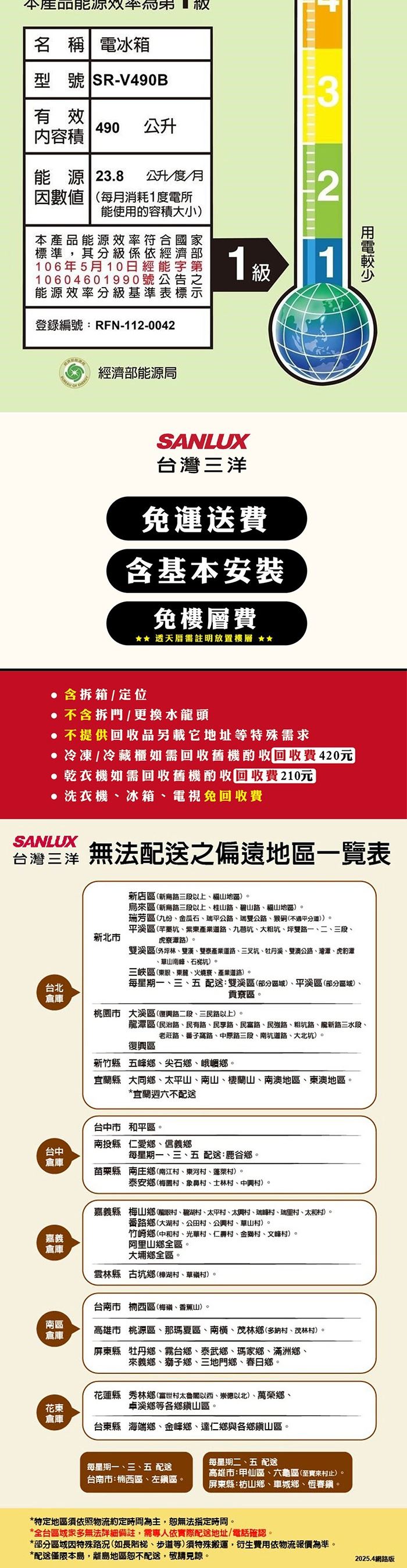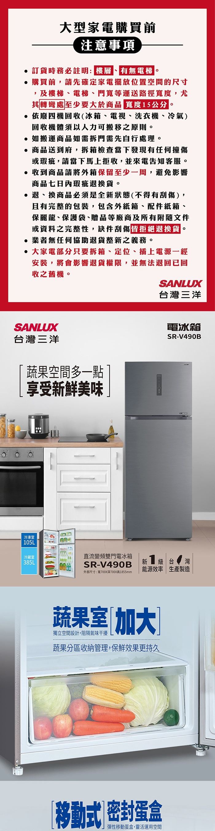 | 商品名稱 | 【SANLUX 台灣三洋】490公升一級能效變頻雙門冰箱(SR-V490B) |