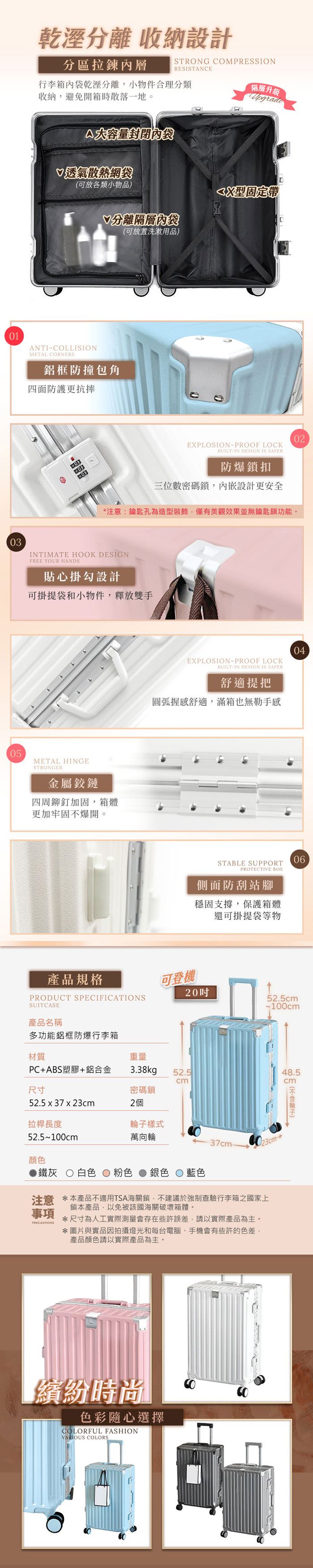 | 【商品規格】 | 顏色:白色/鐵灰色/銀色/藍色/粉色 尺寸(含輪):52.5x37x23cm 箱體尺寸:48.5x37x23cm 重量:3.38kg |