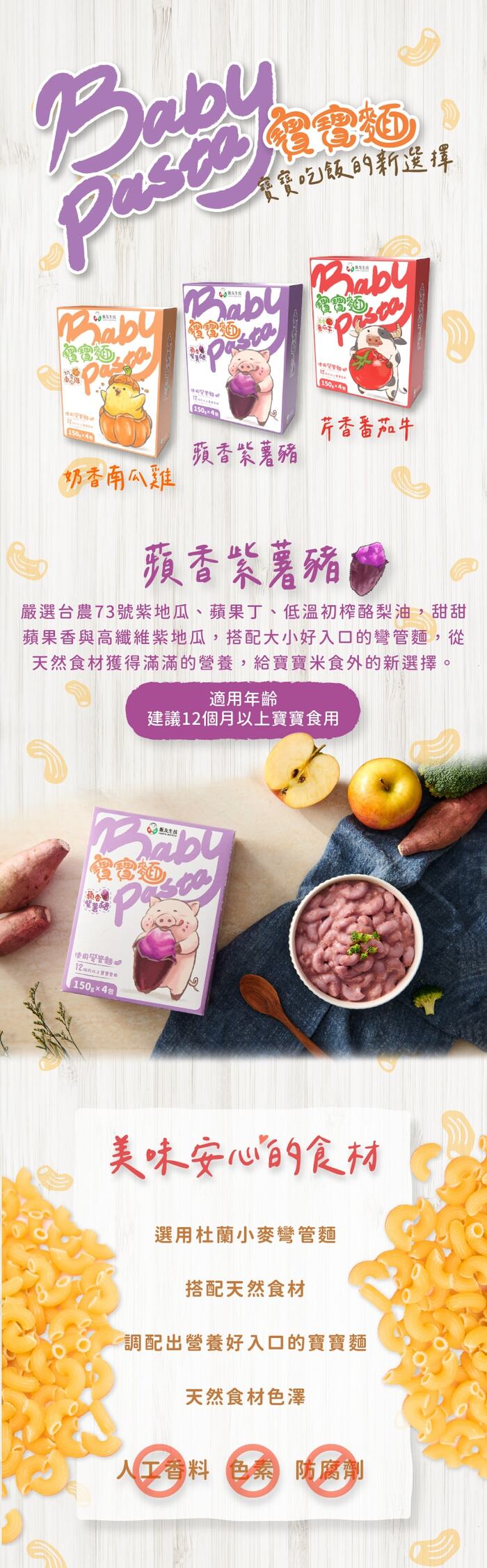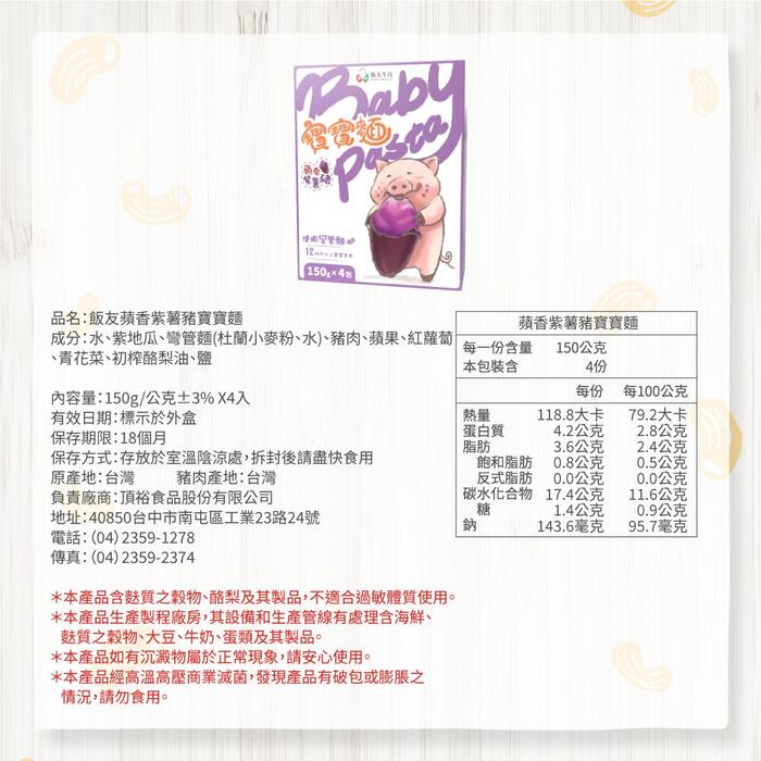 | 商品名稱 | 飯友 蘋香紫薯豬寶寶麵 (150g) 4包/盒 |