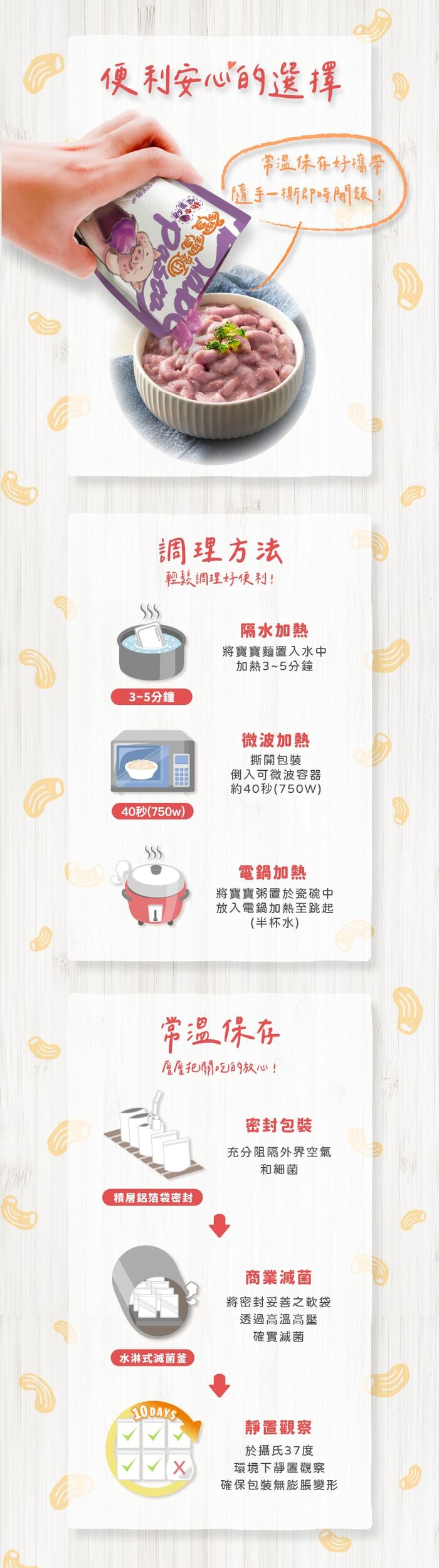| 內容物(完整成份/食品添加物) | 水、紫地瓜、彎管麵(杜蘭沙粒粉、水)、豬肉、蘋果、紅蘿蔔、青花菜、初榨酪梨油、鹽 |
