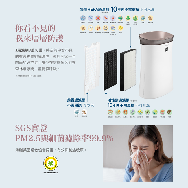 HEPA過濾網(型號,壽命):〇,FZ-M50HFE(壽命10年)*濾網配件視使用環境不同可能需提早更換