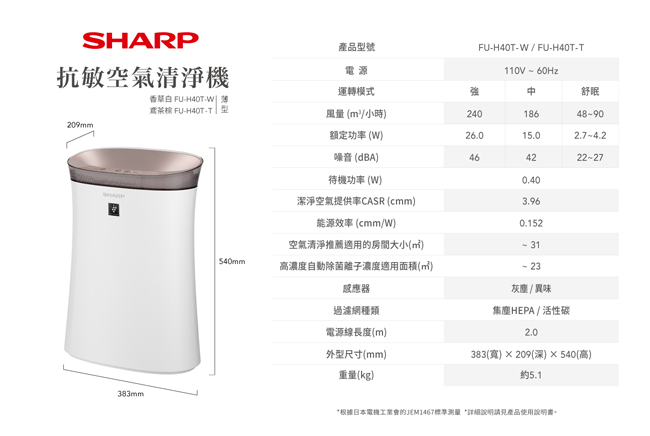 | 商品名稱 | 【SHARP夏普】9坪抗敏空氣清淨機(香草白) FU-H40T-W |
