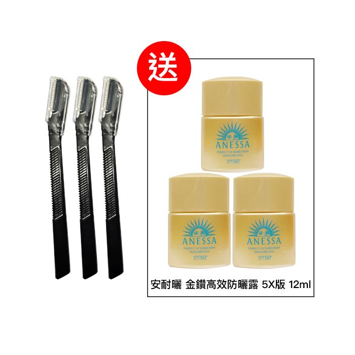 | 商品名稱/包裝內容規格 | 主商品 1. 雅詩蘭黛 專業安全修眉刀 *3 搭贈2. 安耐曬 金鑽高效防曬露 5X版 12ml*3 |