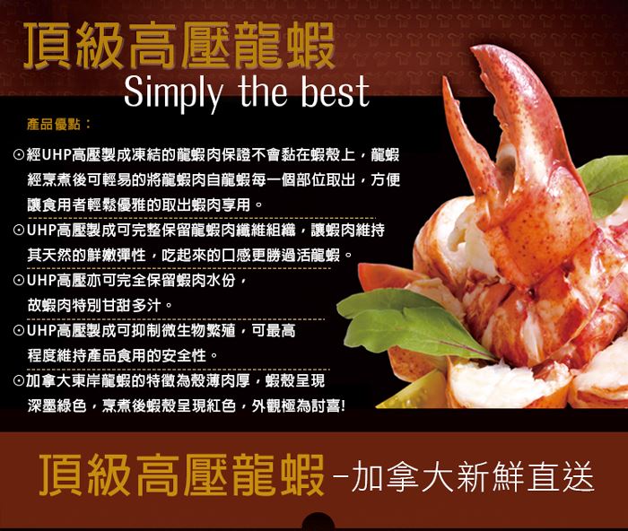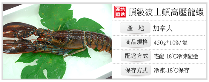 | 商品名稱 | 【築地一番鮮】加拿大直送-頂級波士頓高壓龍蝦8隻(約450G/隻) |