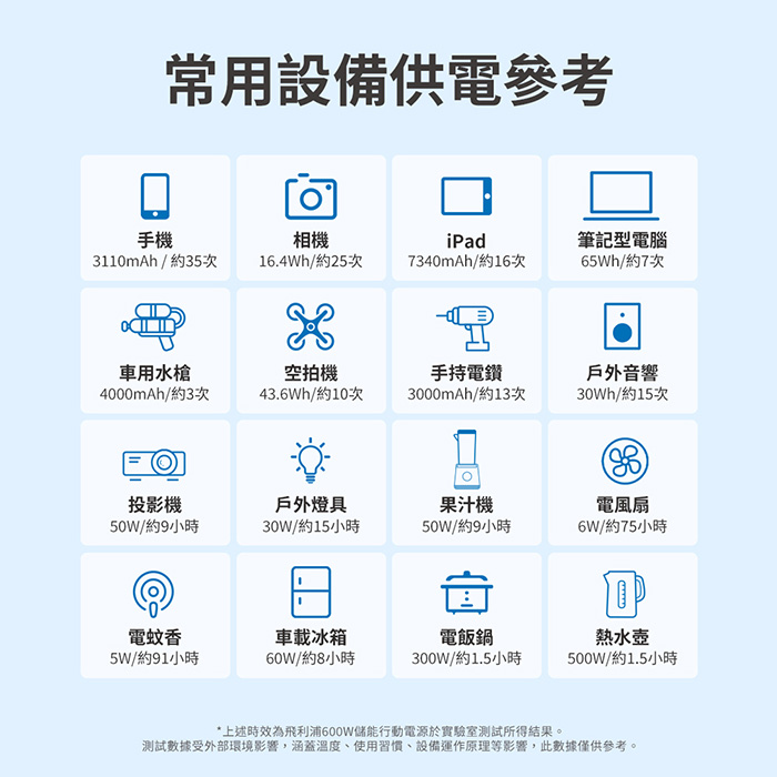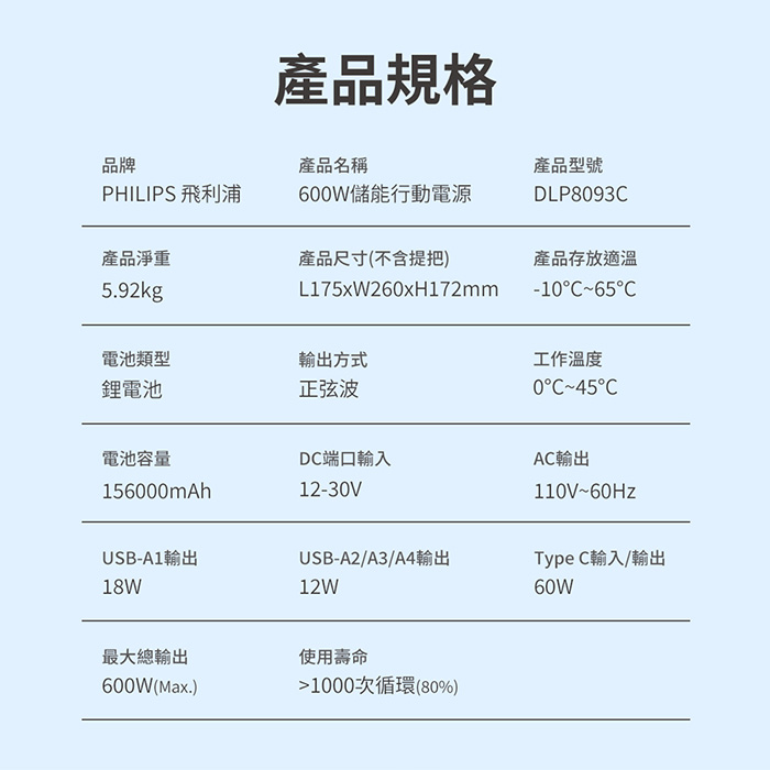 | 【規格或顏色】 | DC輸入:DC 12-30V/3.78A(Max.) USB-C 輸入/輸出:DC 5V/3A, 9V/3A, 12V/3A,15V/3A,20V/3A (Max: 60W) 電池容量:39Ah@14.6V(569.4Wh) AC總輸出:600W(Max.) AC輸出:市電輸出110V~60Hz,額定功率600W 點煙器輸出:DC 12V/10A ,與DC1/2同時輸出共120W USB-A1 輸出:DC 5V/3A,9V/2A,12V/1.5A USB-A2/3輸出:單口輸出DC 5V/2.4A ,同時輸出DC 5V/3A USB-A4輸出:單口輸出DC 5V/2.4A DC總輸出:USB-C+USB-A1,A2,A3,A4+DC1,DC2+點煙器輸出=180W(Max.) 最大總輸出:AC+DC=600W(Max.) 存儲環境溫度:-10 ~ + 65 ℃ 工作環境溫度:0 ~ + 45 ℃ |