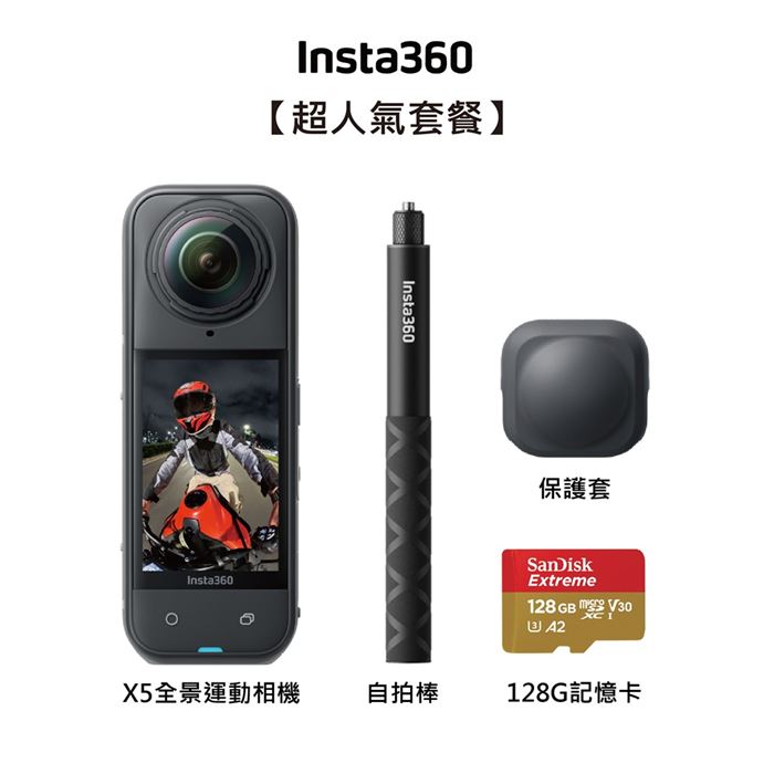 | 【內容物】 | X5主機標準套裝+原廠114CM自拍棒+原廠鏡頭保護套+原廠騎行套餐新版+256GB高速記憶卡 |