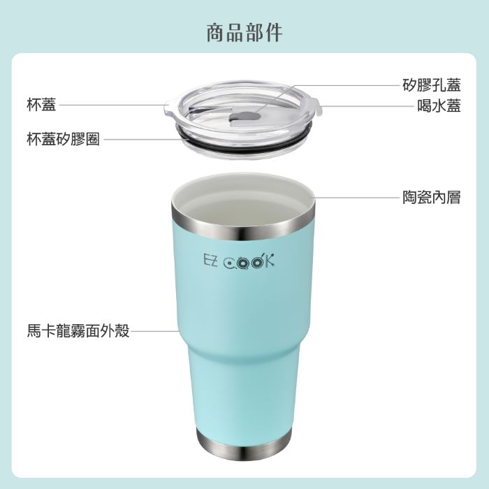 不鏽鋼-杯身;304不鏽鋼-外殼底蓋;烤漆-外殼噴塗;陶瓷釉表層-杯內;PS (聚苯乙烯)-杯蓋、喝水蓋;食品級矽膠-杯蓋矽膠圈 |