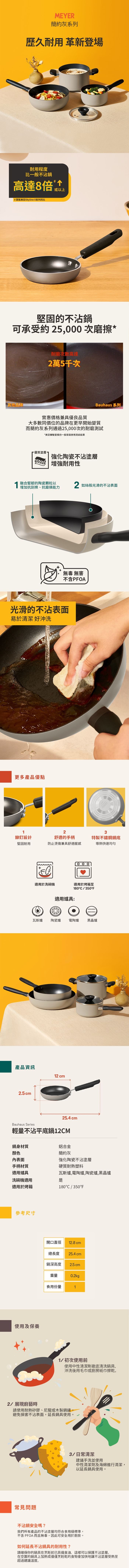 | 保存方法 | 適用爐具:瓦斯爐,電爐,電陶爐,黑晶爐 首次使用 移除鍋具上所有標籤,將鍋具放入含有洗潔精的溫水中,以海綿或洗碗布清洗,再沖淨抹乾。 清潔 為避免食物殘渣堆積、破壞不沾表面、降低效能,每次使用後必須徹底清潔。清洗時請用溫水和配方溫和的洗碗精,搭配海綿徹底洗滌,以避免下次再加熱食物與油脂的殘留物。如鍋子剛離火需立刻沖洗,請翻過鍋身,以冷水沖鍋身背面,減少冷熱差距過大而造成塗層損害。 火力調整要訣 請注意!!不沾鍋適用低、中火力,火焰以不超過鍋底邊緣為原則!!本鍋可容易達到烹調所需的溫度,並均勻導熱;持續的大火會導致表面黏稠和變色。切勿空燒、燒乾,烹調時請勿離開廚房,超高溫加熱不沾鍋所造成的鍋具損傷,恕不包含在產品的保固服務中。 |