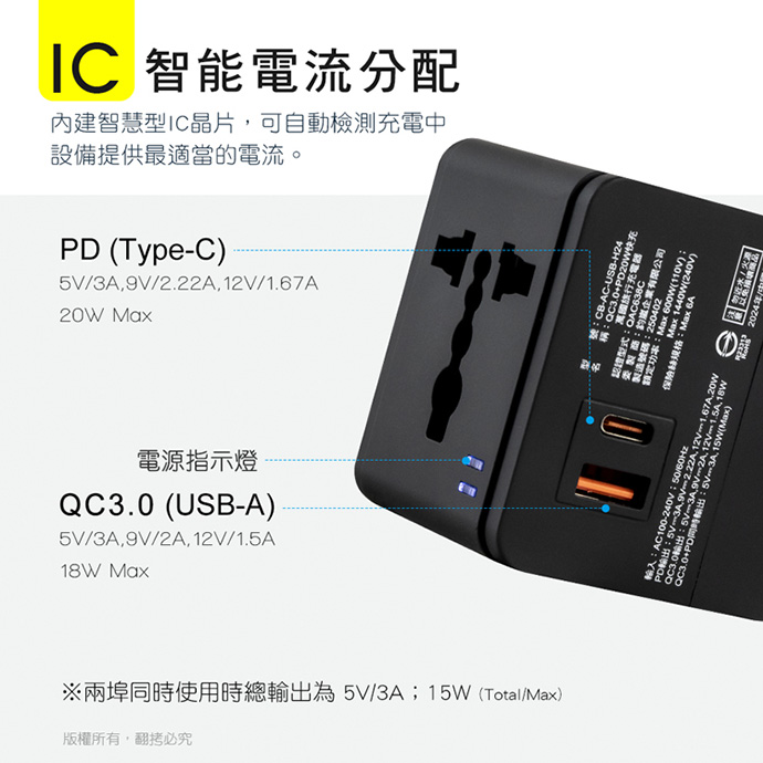 ※當PD孔與USB孔同時使用時,合計最大輸出5V/3A,15W MAX。