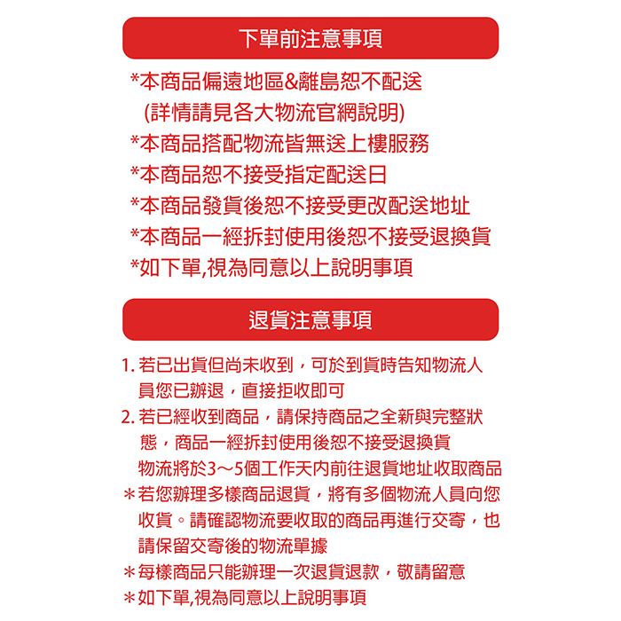 ※如遇颱風地震等天災或其他不可抗力因素(如:疫情、罷工)影響時,出貨時間將順延。