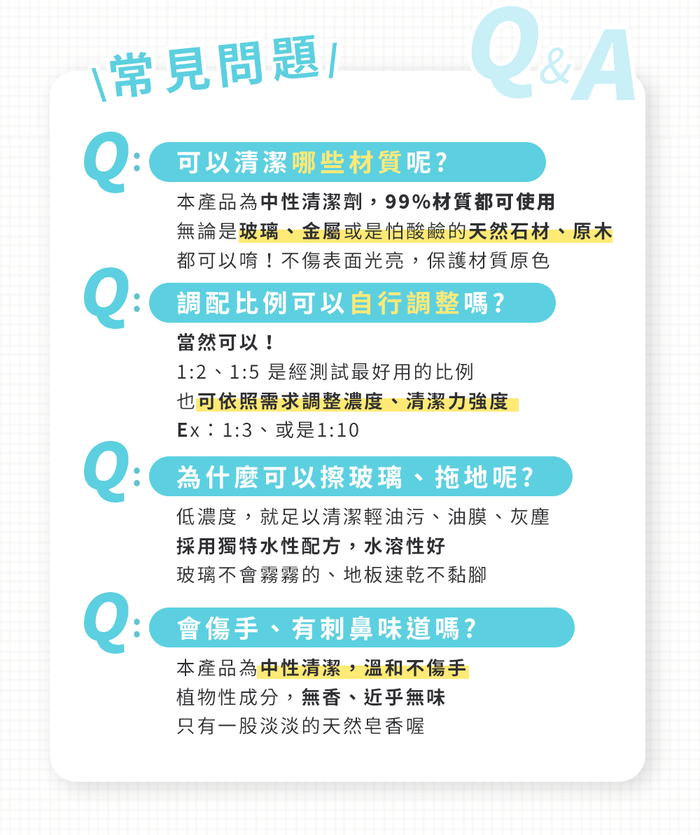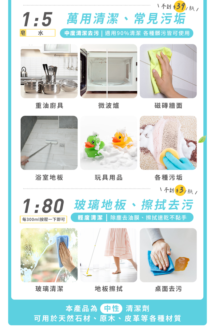 | 注意事項 | 本產品為酸性清潔劑,建議戴手套施作 •請勿使用於「大理石/石材、石英磚、無釉地肉 •請勿與漂白水、小蘇打等鹼性成分混用 •為避免材質褪色,請於不顯眼處測試,再行的 •若不慎濺入眼睛,請用清水沖洗、就診嚴察 |